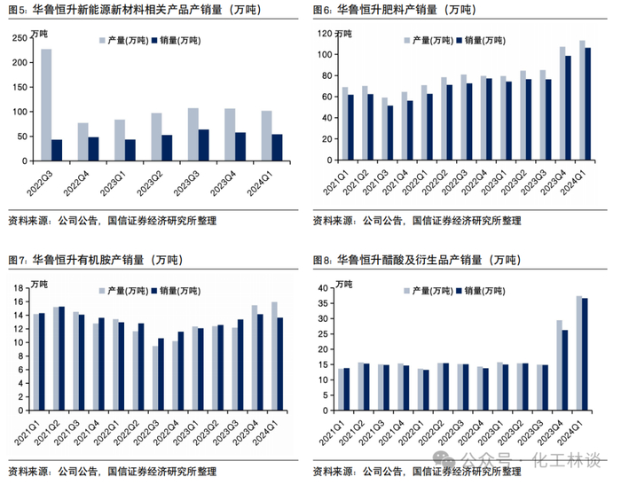 2024年一季度公司主营产品产销量均同比提升。得益于新项目投产及技改扩能,2024年一季度公司主营产品产销量均同比增长,新能源新材料/肥料/有机胺/醋酸及衍生品产量分别为102/113/16/37万吨(同比+21%/+42%/+29%/+138%),销量54/106/14/37万吨(同比+24%/+43%/+13%/+144%)。其中新能源新材料相关产品生产量与销售量差距较大,主要原因是部分中间产品自用。