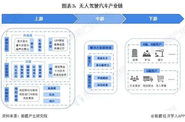从上游系统分拆来看,无人驾驶基本上依赖于感知、决策、执行三个环节的高效配合:感知层通过多维传感器及GPS、北斗等在内的导航系统识别道路上的人、物及标识,并收集车身周围的实时数据;决策层通过芯片、软件/算法、特征提取等预处理,数据融合后作出评估和决策,得出相应的路径规划与决策信号,并输出给各种执行层的控制单元;最终执行层通过接收感知系统的数据及决策系统的决策信号作出相应的反馈动作,实现全套自动驾驶操作。产业链中游主要包括汽车制造商和无人驾驶解决方案提供商,以及落地应用之前的车辆测试与评价环节;下游为无人驾驶汽车应用场景,主要分为政府、企业和个人用户等不同类型。