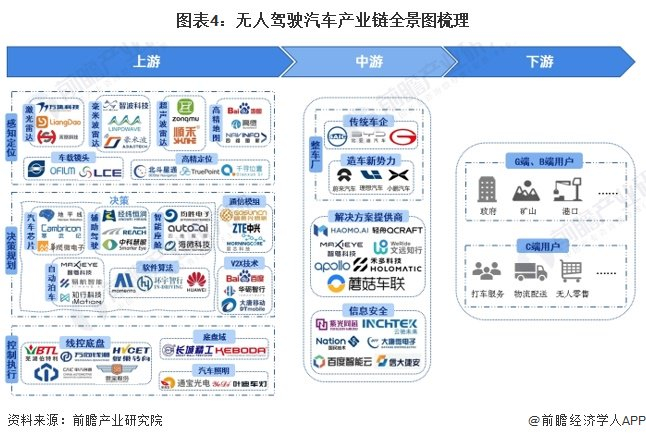 从无人驾驶汽车产业链的参与企业上看,上游感知层参与企业主要有万集科技、欧菲光、四维图新等;决策层参与企业主要有地平线、经纬恒润、均胜电子等;执行层参与企业主要包括伯特利、世宝股份、长城精工等。中游汽车制造商主要包括上汽、广汽、比亚迪等传统车企,以及蔚来汽车、理想汽车等造车新势力;无人驾驶解决方案提供商主要有百度Apollo、智驾科技、蘑菇车联等;此外,还包括国民技术、云驰未来等信息安全解决商。下游主要包括矿山、港口、清洁环卫、物流配送等无人驾驶汽车应用场景。