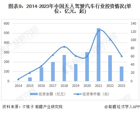根据IT桔子的统计数据,2014-2023年我国无人驾驶汽车领域的投资金额及投资事件数总体均呈增长趋势。投资事件数及金额自2015年出现快速增长,2021年达到顶峰,发生投资事件共129起,投资金额共872.3亿元。2014-2023年间共发生投资事件620起,投资金额2122.12亿元,资金的大量投入催化了无人驾驶技术快速发展、市场接受程度提高,由此也推动了一批重视无人驾驶的车企快速发展。