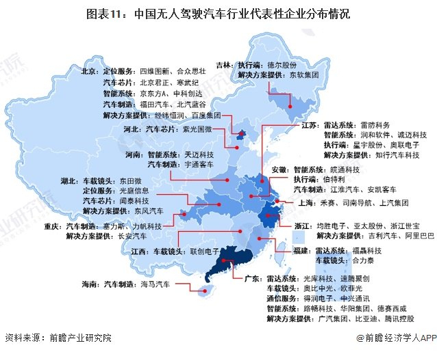 从无人驾驶汽车行业代表性企业的区域分布来看,企业主要布局在广东、浙江、北京、江苏等中东部地区,尤以广东分布最为集中;东北地区也有部分企业分布,西部地区代表性企业分布相对较少。