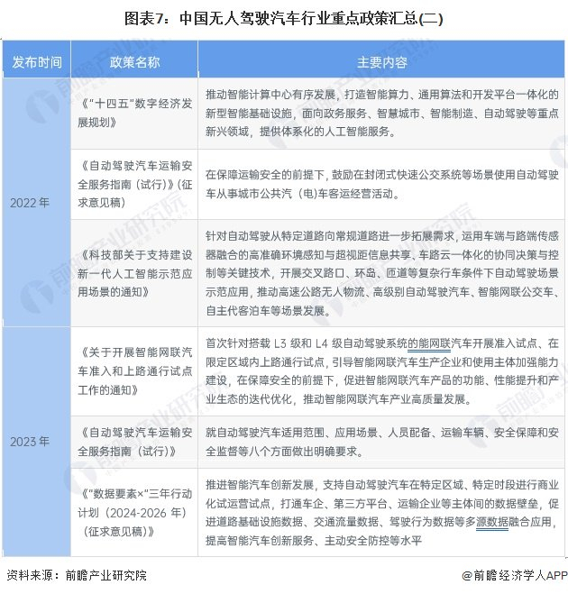 近年来,中国无人驾驶行业受到各级政府的高度重视和国家产业政策的重点支持,工信部、交通运输部、科学技术部、发展改革委、公安部等部委出台了一系列规划及政策推动我国无人驾驶汽车行业发展。在发展规划上,《“十四五”数字经济发展规划》《关于支持建设新—代人工智能示范应用场景的通知》《“数据要素×”三年行动计划(2024-2026年)》等为无人驾驶行业的发展提供了明确、广阔的市场前景,为企业提供了良好的生产经营环境;在产品标准和安全性上,《智能网联汽车生产企业及产品准入管理指南(试行)》《自动驾驶汽车运输安全服务指南(试行)》等从准入门槛、应用场景、安全保障等方面对无人驾驶汽车行业做出了规范。
