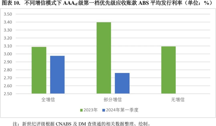 我们进一步观察了不同增信模式下第一档优先级证券的发行利率。2024年第一季度发行的部分增信和全额增信证券的第一档优先级证券平均利率较2023年均出现下降。同一个资产提供方发行的AAAsf级部分增信应收账款ABS平均利率相较2023年下降幅度明显,并且该模式下第一档无增信证券利率普遍高于中间层含增信的证券利率。
