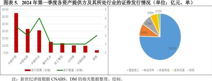 从证券资产提供方来看,2024年第一季度发行证券的资产提供方主要为央企集团公司及其下属子公司,其中以中国中铁、中国电建、中国中冶、中国交建为主(包含下属子公司,尤其是及下属金融或类金融平台)。上述央企集团合计发行数量10单,发行规模127.88亿元,规模占比75.47%,资产提供方集中度高。