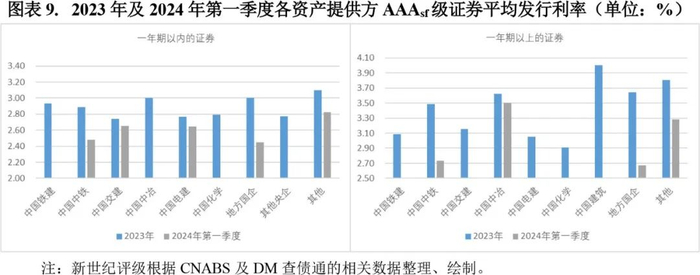 2024年第一季度发行的应收账款ABS仍旧以AAAsf级证券居多,发行利率分布于2.32%至3.80%的区间内。从当期的AAAsf级证券资产提供方来看,其平均发行利率较2023年呈现不同程度的下降,而在集团之间则延续了上年差异化的特点。