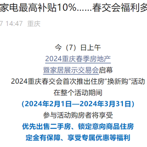 今年1月初,重庆出台的调整优化房地产政策八条措施中,就明确提出支持“以小换大”“以旧换新”的改善购房需求。在此后举行的重庆春季房交会活动(2024年2月1日—3月31日)期间,首次推出了“换新购”活动,共有组织了22家房地产企业75个项目和8家中介机构参与。