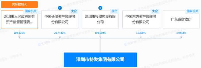 天眼查显示,特发集团的法定代表人为张俊林,由深圳市人民政府国有资产监督管理委员会(简称“深圳国资委”)、中国长城资产管理股份有限公司、深圳市投资控股有限公司、中国东方资产管理股份有限公司、广东省财政厅共同持有,持股比例分别为36.6875%、28.7143%、19.8509%、7.7329%、4.0144%,深圳国资委为实际控制人。