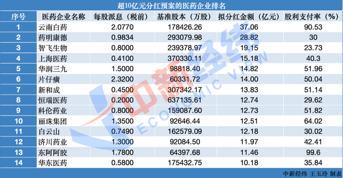 14家医药企业拟分红金额均超10亿元