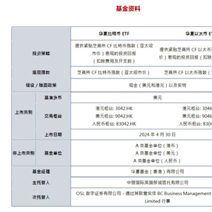 这是一类什么样的产品?以华夏基金(香港)旗下产品为例,两只产品旨在提供紧贴比特币和以太币现货价格的投资回报(扣除费用及开支前)。具体来看,华夏比特币ETF投资策略为提供紧贴芝商所CF比特币指数(亚太收市价)表现的投资回报(扣除费用及开支前),华夏以太坊ETF则提供紧贴芝商所CF以太币指数(亚太收市价)表现的投资回报(扣除费用及开支前)。