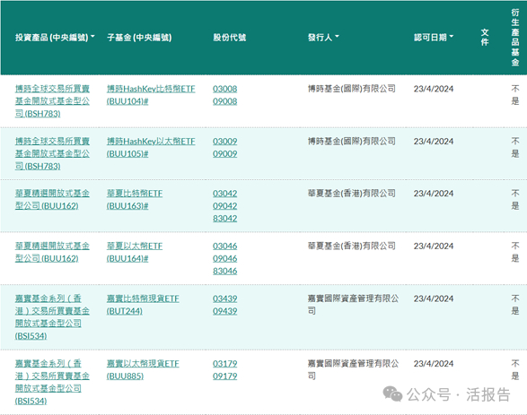 4月24日晚,香港证监会官网正式发布虚拟币现货ETF获批名单,华夏香港、嘉实国际、博时国际申请的首批香港比特币和以太坊现货ETF产品在列。