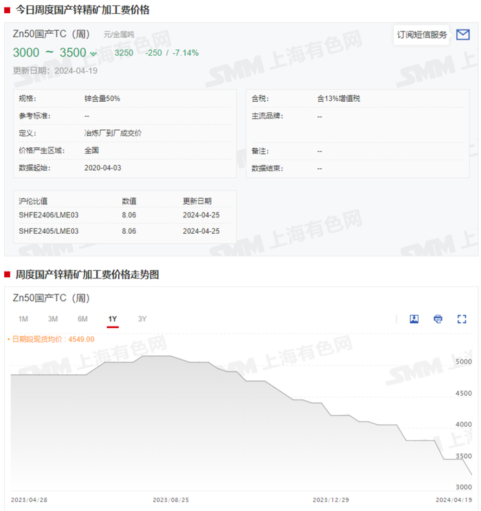 锌方面,据SMM调研显示,自进入2024年以来,矿端供应偏紧的因素便一直在影响着锌市场,国产矿加工费持续走低,持续挤压冶炼厂利润。截至4月19日,Zn50国产TC(周)跌至3000~3500元/金属吨的价位,均价报3250元/金属吨。据SMM调研,当前冶炼厂不包含副产品利润已经出现倒挂。