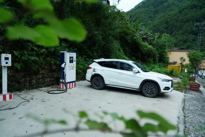 2023年5月19日,一辆新能源车在独龙江乡的充电桩充电。(新华社发)