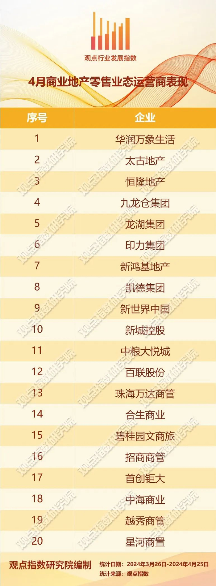 摘要:期内,观点指数观察下的样本企业推动新项目的热度明显下滑,进入了开业淡季。(报告期:2024.03.26-2024.04.25)