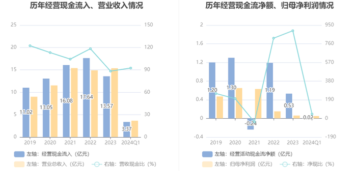 2024年第一季度,公司营业收入现金比为92.48%,净现比为44.18%。
