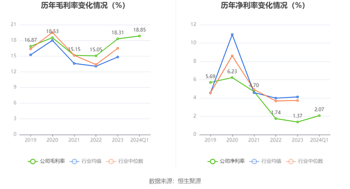 2024年第一季度,公司毛利率为18.85%,同比下降0.50个百分点;净利率为2.07%,较上年同期下降0.27个百分点。