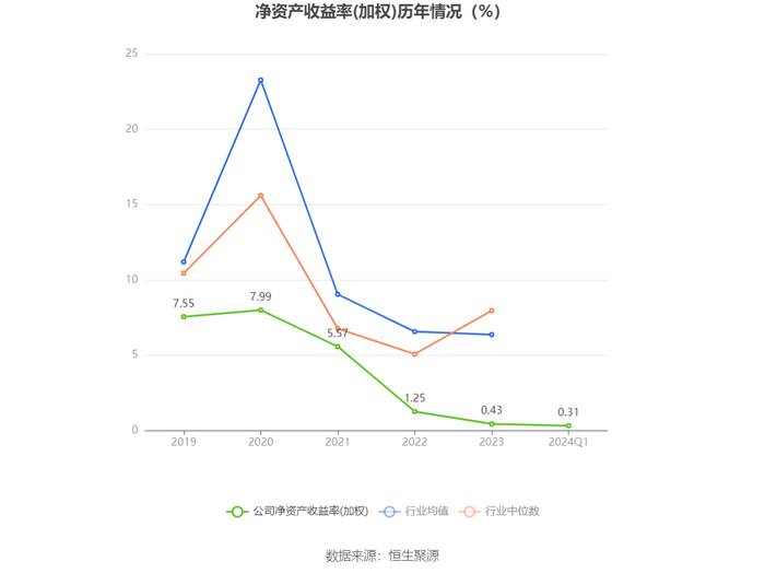 数据显示,2024年第一季度公司加权平均净资产收益率为0.31%,较上年同期下降0.13个百分点;公司2024年第一季度投入资本回报率为0.53%,较上年同期基本持平。