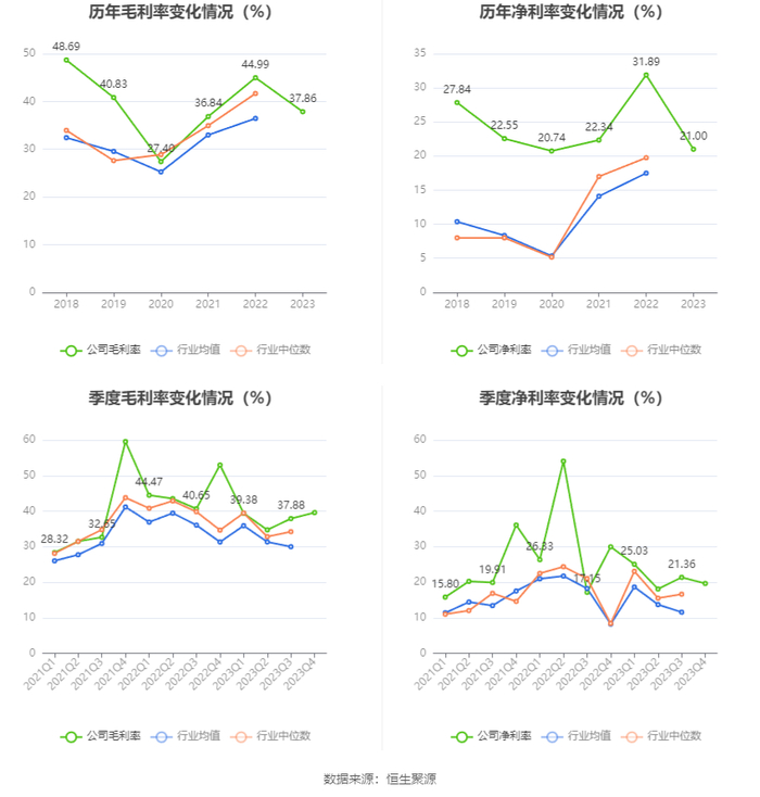 2023年,公司毛利率为37.86%,同比下降7.13个百分点;净利率为21.00%,较上年同期下降10.89个百分点。从单季度指标来看,2023年第四季度公司毛利率为39.58%,同比下降13.38个百分点,环比上升1.70个百分点;净利率为19.63%,较上年同期下降10.32个百分点,较上一季度下降1.73个百分点。