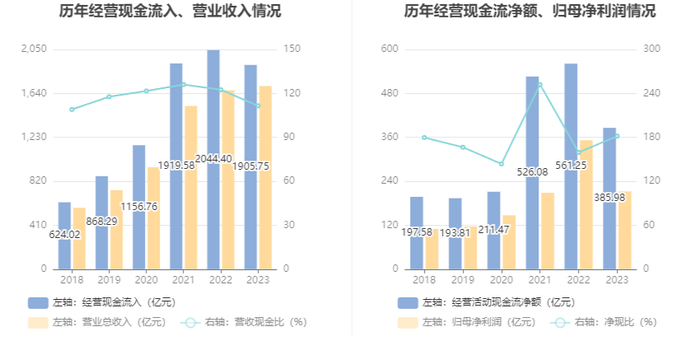 2023年,公司营业收入现金比为111.53%,净现比为181.73%。