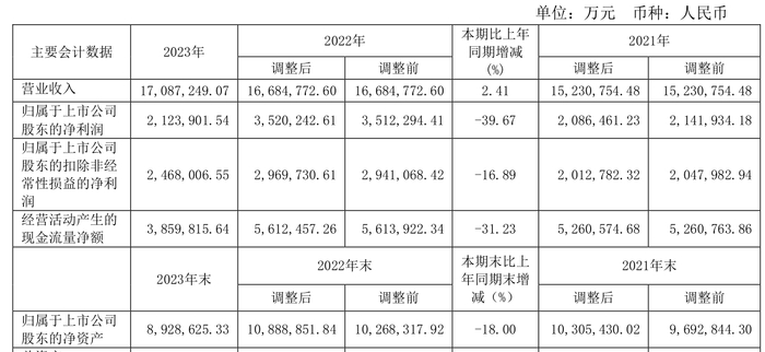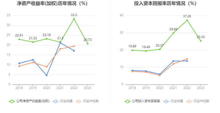数据显示,2023年公司加权平均净资产收益率为20.73%,较上年同期下降12.57个百分点;公司2023年投入资本回报率为25.30%,较上年同期下降11.96个百分点。