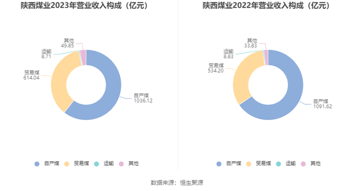 分产品来看,2023年公司主营业务中,自产煤收入1036.12亿元,同比下降5.08%,占营业收入的60.64%;贸易煤收入614.04亿元,同比增长14.94%,占营业收入的35.94%;运输收入8.71亿元,同比下降1.30%,占营业收入的0.51%。