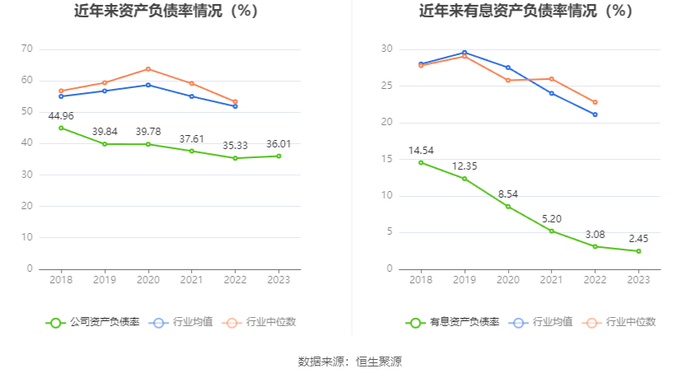 在偿债能力方面,公司2023年年末资产负债率为36.01%,相比上年末上升0.68个百分点;有息资产负债率为2.45%,相比上年末下降0.63个百分点。