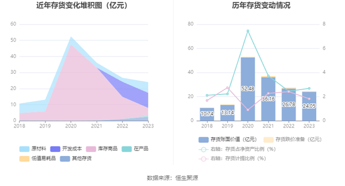 从存货变动来看,截至2023年年末,公司存货账面价值为24.05亿元,占净资产的2.69%,较上年末减少2.73亿元。其中,存货跌价准备为4472.5万元,计提比例为1.83%。