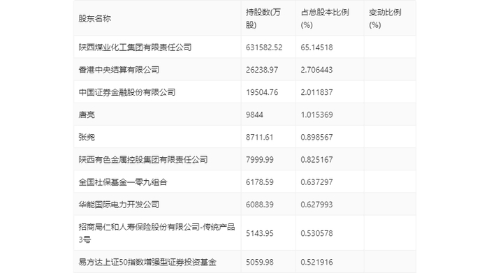年报显示,2023年年末公司十大流通股东中,新进股东为易方达上证50指数增强型证券投资基金,取代了三季度末的刘晓燕。在具体持股比例上,陕西煤业化工集团有限责任公司、张尧、全国社保基金一零九组合持股有所上升,香港中央结算有限公司、唐亮、招商局仁和人寿保险股份有限公司-传统产品3号持股有所下降。