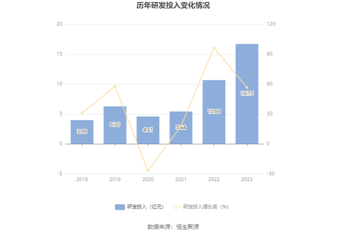 2023年全年,公司研发投入金额为16.75亿元,同比增长56.71%;研发投入占营业收入比例为0.98%,相比上年同期上升0.34个百分点。此外,公司全年研发投入资本化率为56.18%。