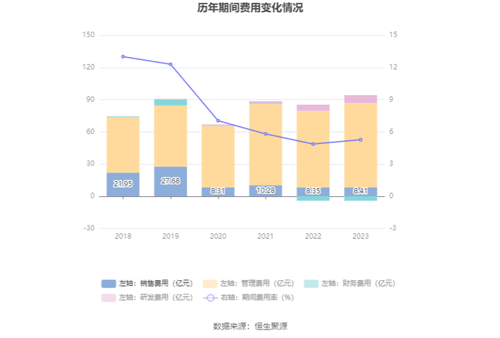 2023年,公司期间费用为90.01亿元,较上年同期增加8.75亿元;期间费用率为5.27%,较上年同期上升0.40个百分点。其中,销售费用同比增长0.62%,管理费用同比增长10.14%,研发费用同比增长26.91%,财务费用由去年同期的-4.09亿元变为-4.17亿元。