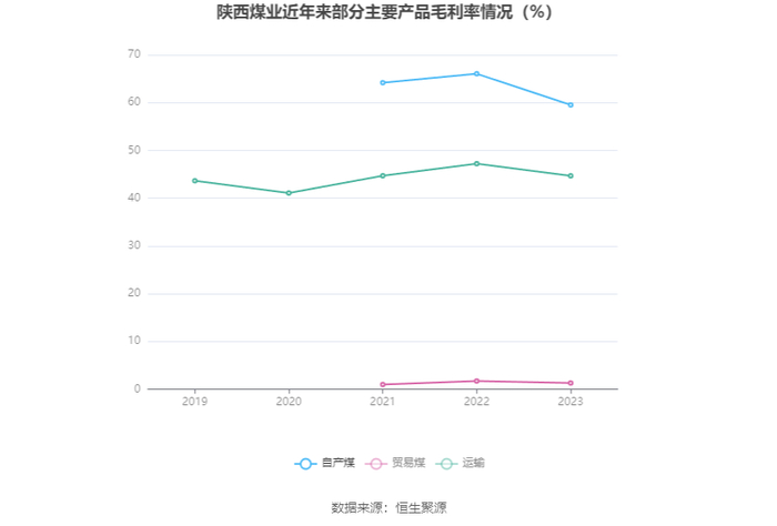 分产品看,自产煤、贸易煤、运输2023年毛利率分别为59.52%、1.29%、44.67%。