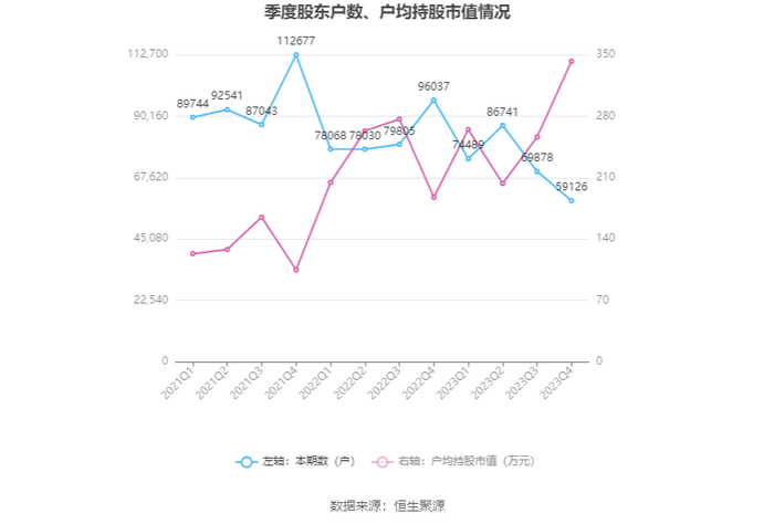 筹码集中度方面,截至2023年年末,公司股东总户数为5.91万户,较三季度末下降了1.08万户,降幅15.39%;户均持股市值由三季度末的256.12万元上升至342.54万元,增幅为33.74%。