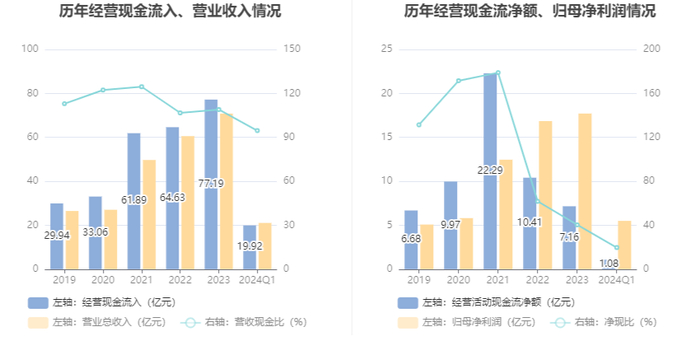2024年第一季度,公司营业收入现金比为94.61%,净现比为19.70%。