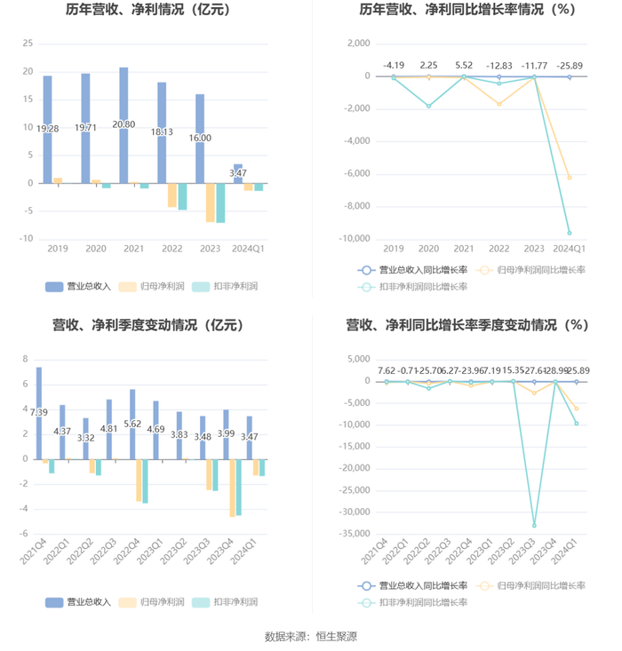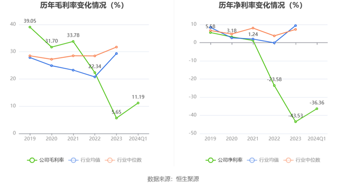 2024年第一季度,公司毛利率为11.19%,同比下降31.30个百分点;净利率为-36.36%,较上年同期下降37.25个百分点。