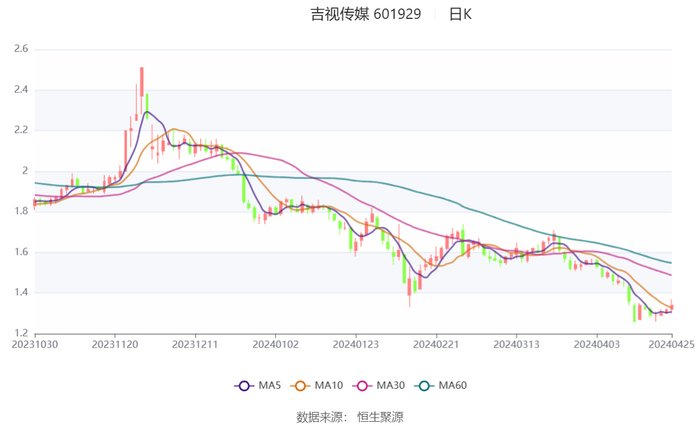 中证智能财讯 吉视传媒(601929)4月26日披露2024年一季报。2024年第一季度,公司实现营业总收入3.47亿元,同比下降25.89%;归母净利润亏损1.28亿元,上年同期盈利208.54万元;扣非净利润亏损1.33亿元,上年同期盈利140.27万元;经营活动产生的现金流量净额为1.22亿元,上年同期为-4464.09万元;报告期内,吉视传媒基本每股收益为-0.0366元,加权平均净资产收益率为-1.97%。