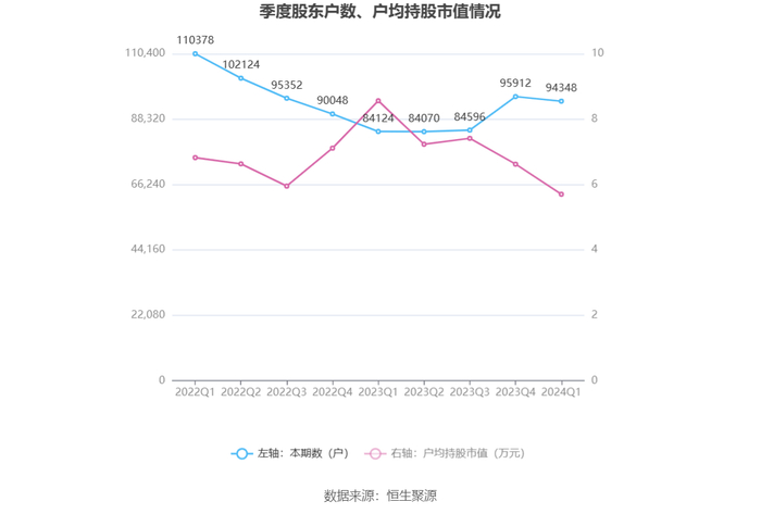 筹码集中度方面,截至2024年一季度末,公司股东总户数为9.43万户,较上年末下降了1564户,降幅1.63%;户均持股市值由上年末的6.62万元下降至5.70万元,降幅为13.90%。
