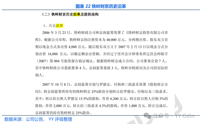 一切得从铁岭财京的成立说起。铁岭财京作为业务上标准的城投企业,作为依赖公权力实现区域垄断的土地开发业务实施主体,在股权上成立伊始就反常的带有民企基因。铁岭财京2006年3月23日签署成立,成立之初铁岭财京与民企京润蓝筹各占股50%。而合作方京润蓝筹成立于2006年3月13日,此时仅是成立10天的皮包公司。2007年京润蓝筹又把25%股权原价转让给罗德安、付驹以及三助嘉禾公司。