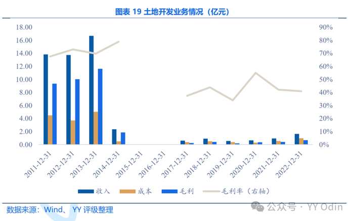 在2011-2013年的虚假业绩之后,公司的土地开发业务断崖式下跌,收入再未超过2.5亿,甚至业务在部分年份都没开张。