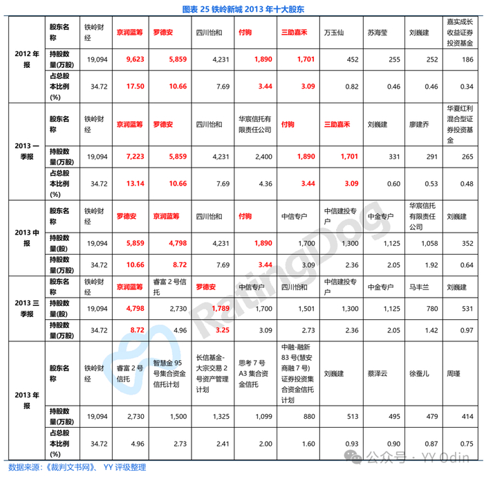 5)最后也是最重要的线索,重组方股东退出的时间顺序。以上市公司季度披露十大股东数据入手。重组方股票于2013年1月5日解禁。京润蓝筹在2013年一二季度季度减持近半,剩余在四季度减持;三助嘉禾在二季度全部退出;付驹在三季度全部退出;罗德安在三四季度逐步退出。所有重组合作方在2013年一年内全部获利退出。整体看,优先度上三助嘉禾 > 付驹 > 罗德安。