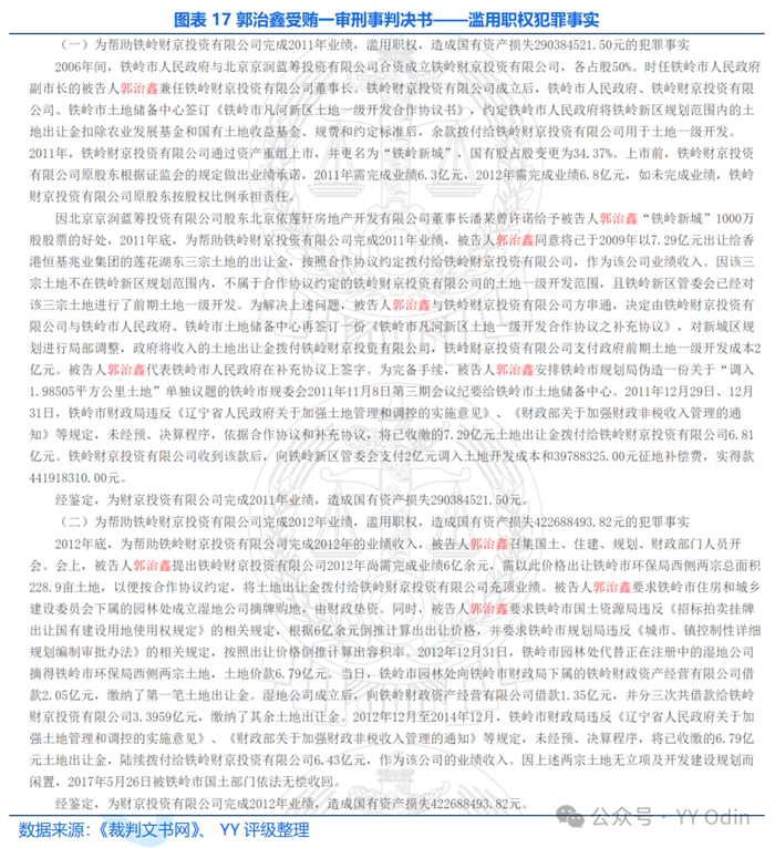 判决书中列示第一、二条滥用职权犯罪事实(上图),郭治鑫为帮助铁岭新城完成2011-2012业绩承诺以保证重组合作方顺利退出,2011年将09年时已出让土地的土地出让金作为业绩收入拨给铁岭新城,2012年通过铁岭市园林处成立国企虚假拿地支持铁岭新城业绩。郭治鑫前后还利用各种手段,包括调整新区规划、伪造会议纪要等,配合上述操作。具体操作细节可参考上图。两年间在新区土地出让不利的情况下撑起公司虚假业绩,手段精彩,富有想象力。