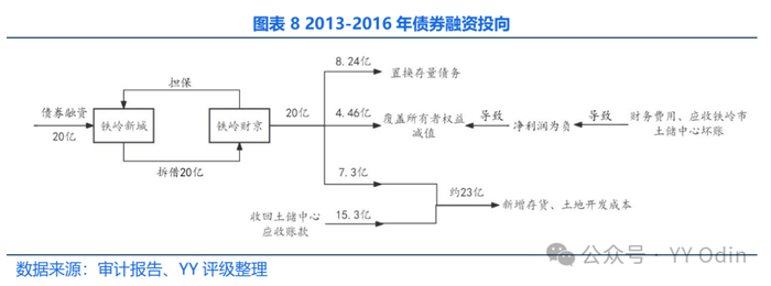 2013-2016年新发债券合计融资20亿,投向如下图所示,除置换存量债务与覆盖日常亏损外,主要投向存货科目所对应的土地开发成本。从举债资金用途上看,最终投向城投类业务。