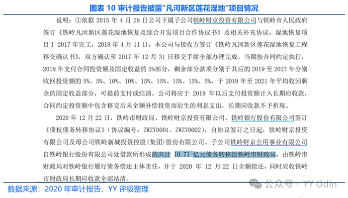 2020年,有息债务减少10.08亿。资产端,主要牵涉“凡河新区莲花湿地”项目,该项目2017年完工、2018年移交政府,由【存货-土地开发】转计至【长期应收款】。债务端,2016-2017年公司以该项目产生的应收铁岭市财政局应收账款等质押向建设银行前后贷款合计10.71亿,估计主要用于支付2017年3月回售的“14铁岭债” 10.07亿。2020年铁岭市财政局通过承接债务,替公司偿还该部分款项。