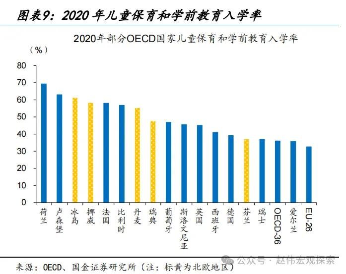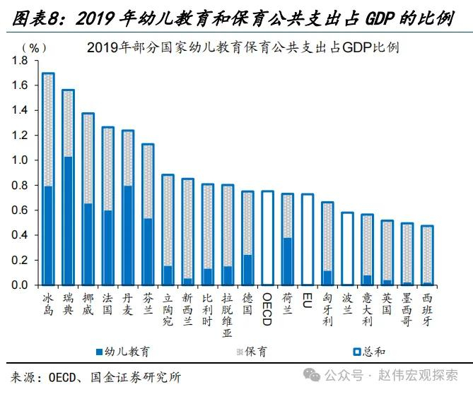 (2)降低养育成本政策主要采取补贴托育费用、建设公共托育机构等措施,以瑞典为代表的北欧国家最为典型。OECD数据显示,2021年冰岛、瑞典等北欧国家幼儿教育和保育公共支出占GDP比重均超1%、位居世界前列;较高的幼儿教育及保育公共支出力度下,北欧地区幼儿托育费用约占家庭平均收入比例较低,儿童保育和学前教育普及率较高。