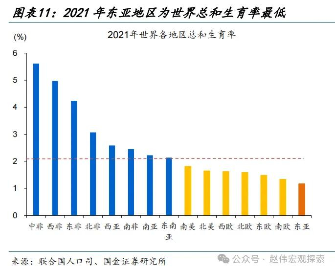 东亚地区总和生育率自1963年后持续下滑,2021年降至世界生育水平最低,其中韩国生育率下滑至0.7、日本生育率维持在1.3左右。相比欧洲地区,东亚地区总和生育率下降速度明显较快,过去六十年间,东亚地区总和生育率下滑超5.3,降幅超同期其他地区。2021年东亚总和生育率下滑至1.17、低于欧洲地区的1.48,为世界上总和生育率水平最低的地区;其中,韩国的生育率下降至0.7,成为全球总和生育率最低的国家。