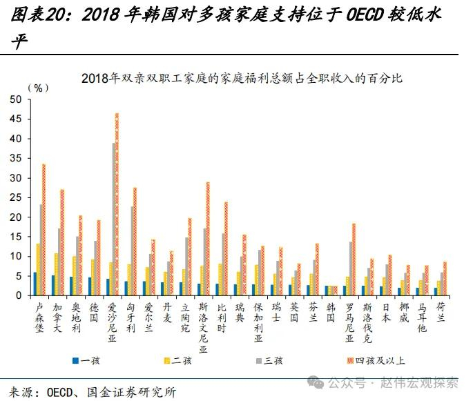 相比日本总和生育率维持1.3左右,韩国总和生育仍未企稳或缘于生育率政策推出较晚、且政策支出力度不足。相比日本于1994年总和生育率在1.49时出台生育率政策,2006年韩国在其总和生育率降至1.1时推行“低生育与老龄化社会基本计划”。且与其他OECD国家相比,韩国生育政策支持力度较低。2018年韩国对于育儿双职工家庭公共福利支持力度占家庭收入比例仅2.5%、显著低于其余OECD国均值10%;2019年韩国家庭福利公共支出占GDP比重为1.56%、明显低于OECD国均值2.3%。