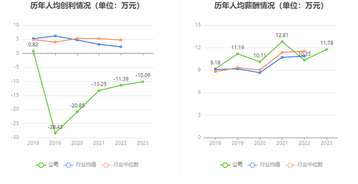 截至2023年末,公司员工总数为614人,人均创收43.39万元,人均创利-10.09万元,人均薪酬11.78万元,较上年同期分别增长0.25%、11.40%、13.74%。