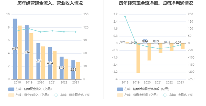 2023年,公司营业收入现金比为109.80%,净现比为-11.08%。