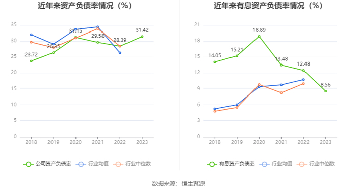 在偿债能力方面,公司2023年年末资产负债率为31.42%,相比上年末上升3.03个百分点;有息资产负债率为8.56%,相比上年末下降3.92个百分点。