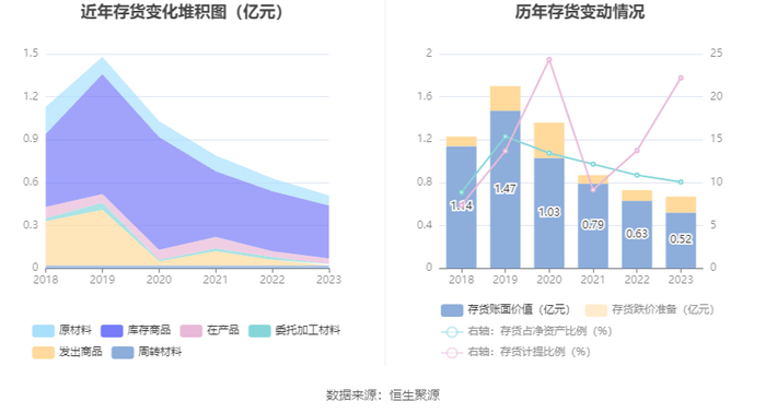 从存货变动来看,截至2023年年末,公司存货账面价值为5173.92万元,占净资产的10.07%,较上年末减少1076.95万元。其中,存货跌价准备为1477.97万元,计提比例为22.22%。