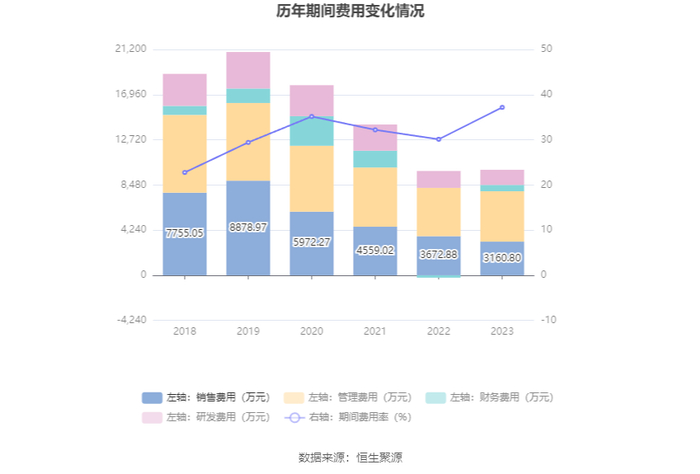 2023年,公司期间费用为9904.88万元,较上年同期增加338.43万元;期间费用率为37.18%,较上年同期上升7.07个百分点。其中,销售费用同比下降13.94%,管理费用同比增长4.23%,研发费用同比下降10.31%,财务费用由去年同期的-225.82万元变为596.22万元。