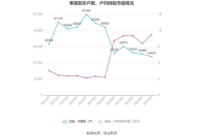 筹码集中度方面,截至2023年年末,公司股东总户数为3.24万户,较三季度末下降了2054户,降幅5.96%;户均持股市值由三季度末的9.59万元上升至11.24万元,增幅为17.21%。